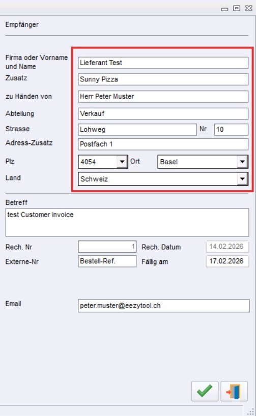 Beim Erstellen einer Rechnung in eezytool, unserer Schweizer Buchhaltungssoftware, stehen mehrere Felder zur Verfügung, um die Informationen des Empfängers zu erfassen, zum Beispiel: